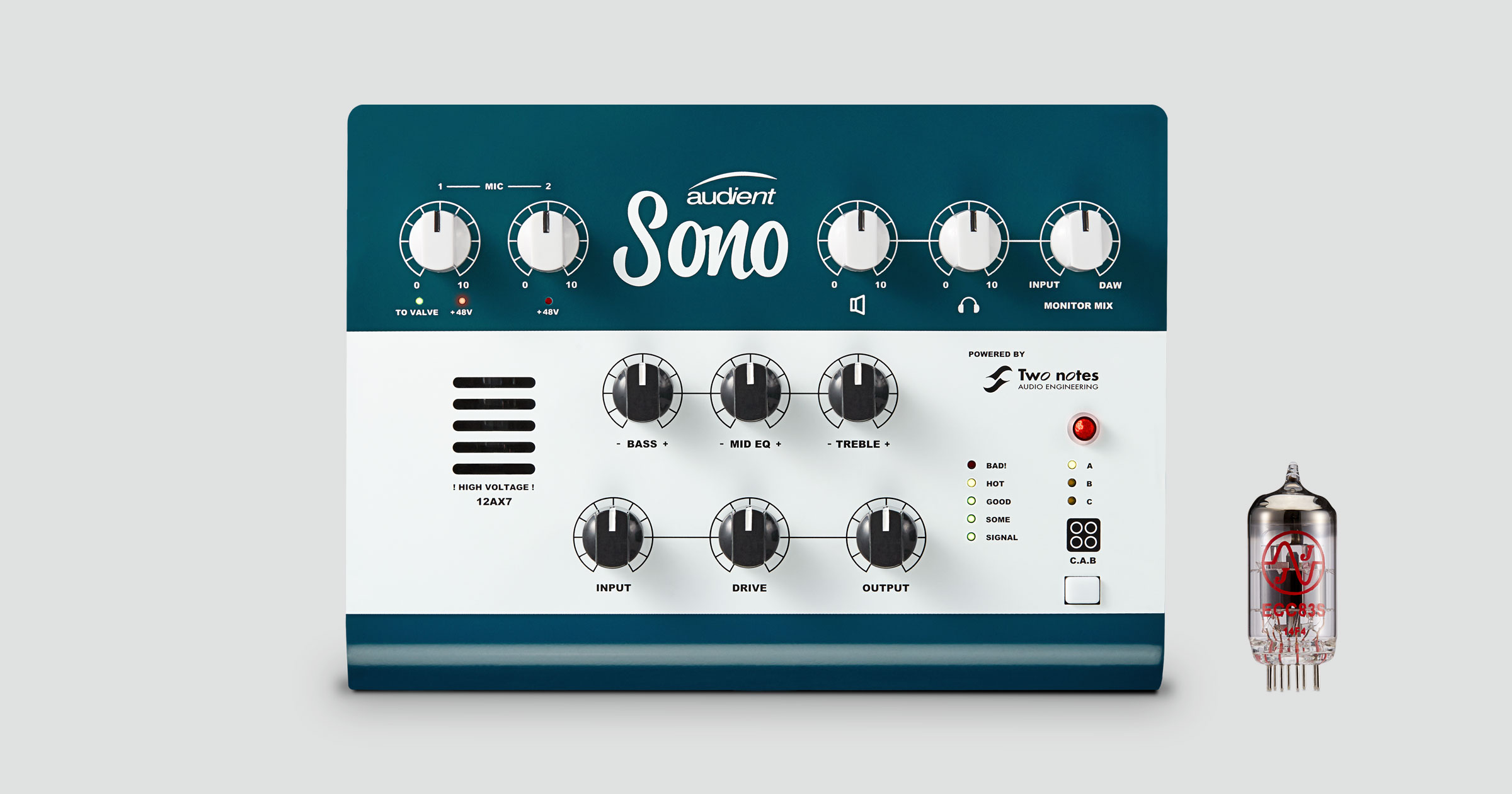 Sono、それはギタリストやミュージシャン用に最適化されたオーディオ・インターフェース。アナログ・レコーディングを知り尽くした「Audient」とスピーカーCABエミュレーションのパイオニア「Two notes」のコラボレーションで誕生しました。