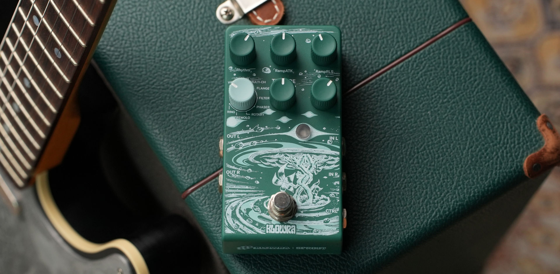 KLOWRA Sprout Modulation(スプラウト・モジュレーション)は、スタジオ級のモジュレーションからシンセサイザー的な温かみまで——9 種類のモジュレーションタイプを搭載したステレオ・ペダルです。LFO のテクスチャーやディレイ系アルゴリズムを Tap Tempo で演奏に同期し、Ramp でパラメーターを時間軸に沿って変化させることで、ジャンルを横断するサウンドメイクが可能です。