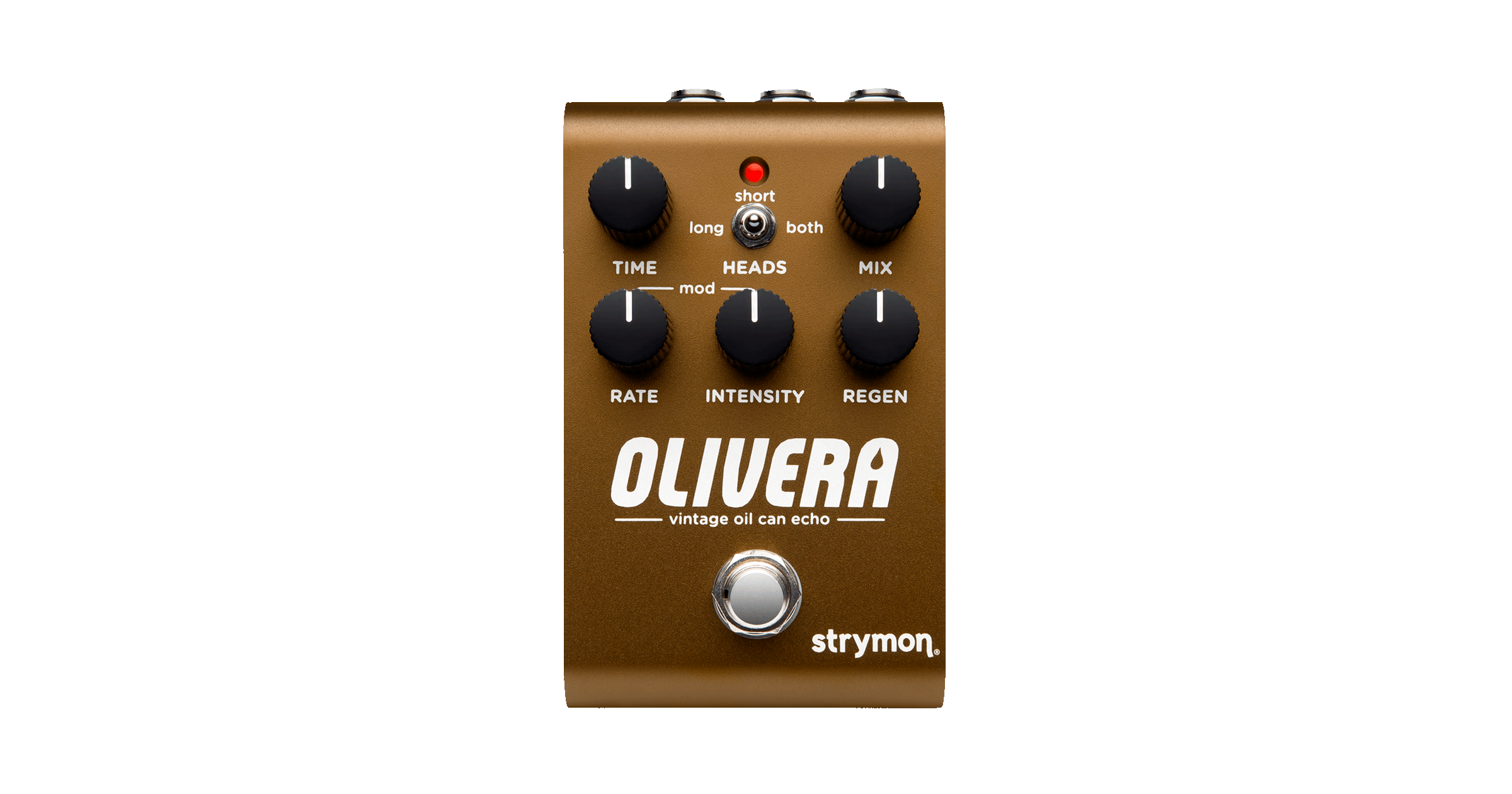 ペダル上部のレッドLEDが点灯している場合は、エフェクトがオンになっていることを示します。デフォルトではトゥルーバイパスが選択されていますが、Oliveraはオプションでバッファードバイパスへの設定変更も可能です。フットスイッチを押しながらREGENを回すと、ライブエディットのTONE機能が調整できます。フットスイッチを2秒間長押しするとSAVE/EXPRESSIONモードに入るか、エクスプレッションペダルのパラメータ割り当てを設定できます。