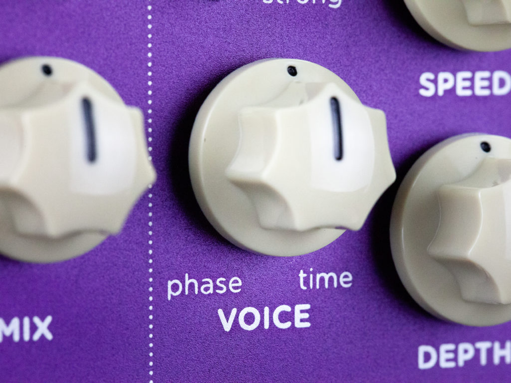 単なるフェイザーとフランジャーのミックスではなく、新鮮で音楽的な幅広いNewトーンを究めることができます。VOICEノブを右に回すとリッチなフランジャー効果が得られ、豊かなビンテージコーラスサウンドが深淵まで響きます。